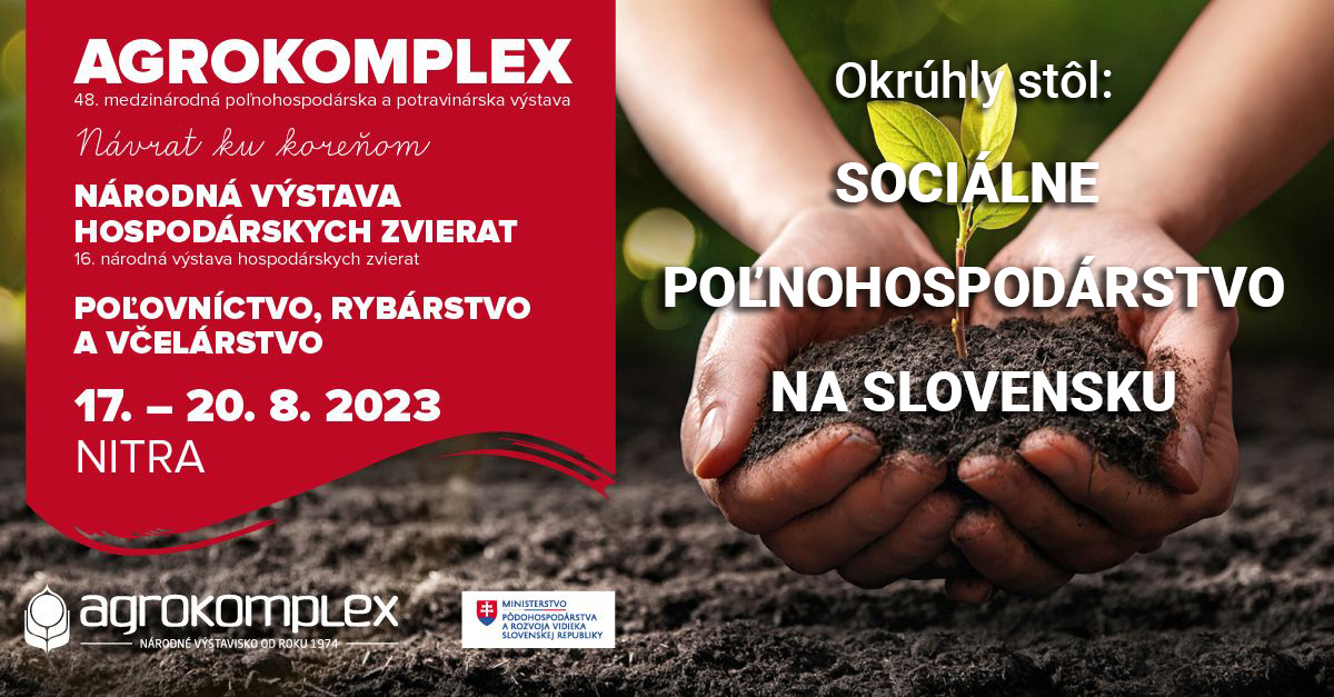 Tento rok prinášame prvý krát koncept sociálneho poľnohospodárstva na najväčšiu poľnohospodársku výstavu na Slovensku AGROKOMPLEX 2023 v Nitre. Uskutoční sa 17 – 20. augusta 2023 na výstavisku Agrokomplex a počas celého trvania výstavy budeme mať svoj stánok v pavilóne E2. Dozviete sa tu o koncepte sociálneho poľnohospodárstva a o našej práci.
