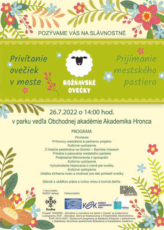 Oficiálne zahájenie iniciatívy „Rožňavské ovečky“, ktorá vznikla v rámci projektu „SINZEM – Sociálne a inovačne na zeleň v meste“. Na podujatí privítajú obyvatelia mesta ovečky, o ktoré sa budú starať klienti Domova sociálnych služieb Jasanima a miesto kosenia budú spásať vybrané zelené plochy v meste Rožňava.
