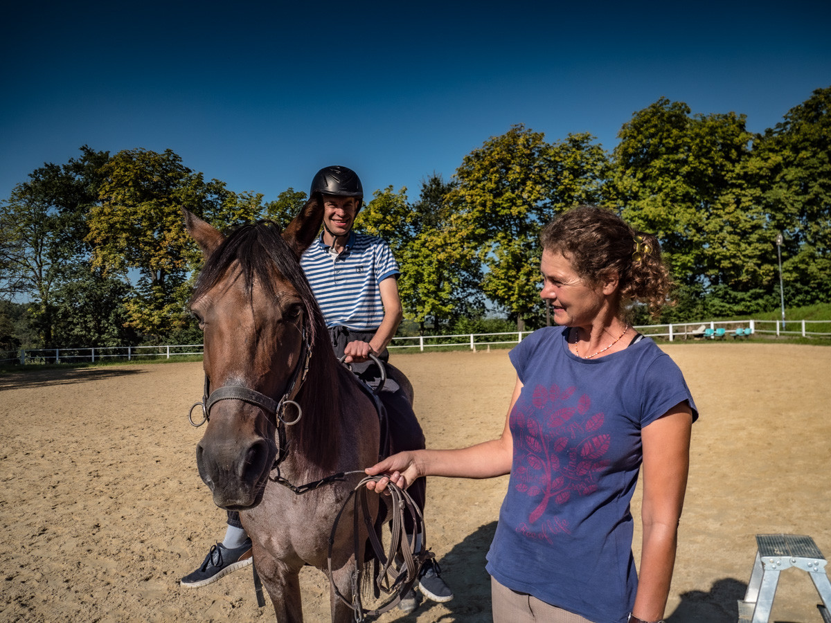 Vonku nás čaká krásne upravené a zelené prostredie, o ktoré sa starajú aj klienti v rámci pracovnej rehabilitácie. Prechádzame po včeľom chodníku s náučnými tabuľami, popri ktorom sú vysadené kvety a byliny vhodné pre včely, a cestou objavujeme aj ovocné kríky a zeleninu, ktorá sa ďalej využíva aj na predaj, no najmä do jedálne. Dôležitou súčasťou sú konské stajne a kone, ktoré využívajú ako hotel pre kone, na rekreačné jazdy pre verejnosť, no aj na hipoterapiu, čo sa nám podarilo v čase našej návštevy aj vidieť priamo v praxi. Na okraji centra sme objavili viaceré drevené chatky, ktoré sa hneď po dokončení začali využívať ako ubytovanie pre Ukrajincov, ktorí sú tam dodnes. Počítajú ale s tým, že by to radi do budúcna využili ako ubytovanie pre návštevníkov workshopov na predĺžených pobytoch. Ako posledné navštevujeme kontajnerový vkusný obchodík, v ktorom predávajú taktiež znevýhodnení ľudia, ktorých už na prvý pohľad táto práca napĺňa. Obchodík zahŕňa ponuku ich vlastných biopotravín a včelích produktov, no i predmetov a produktov nimi vytvorenými. V obchodíku sme radi nakúpili, pretože okrem nápaditých darčekov s dušou sme tak podporili rehabilitácie pre ľudí s postihnutím, kam zisk putuje.